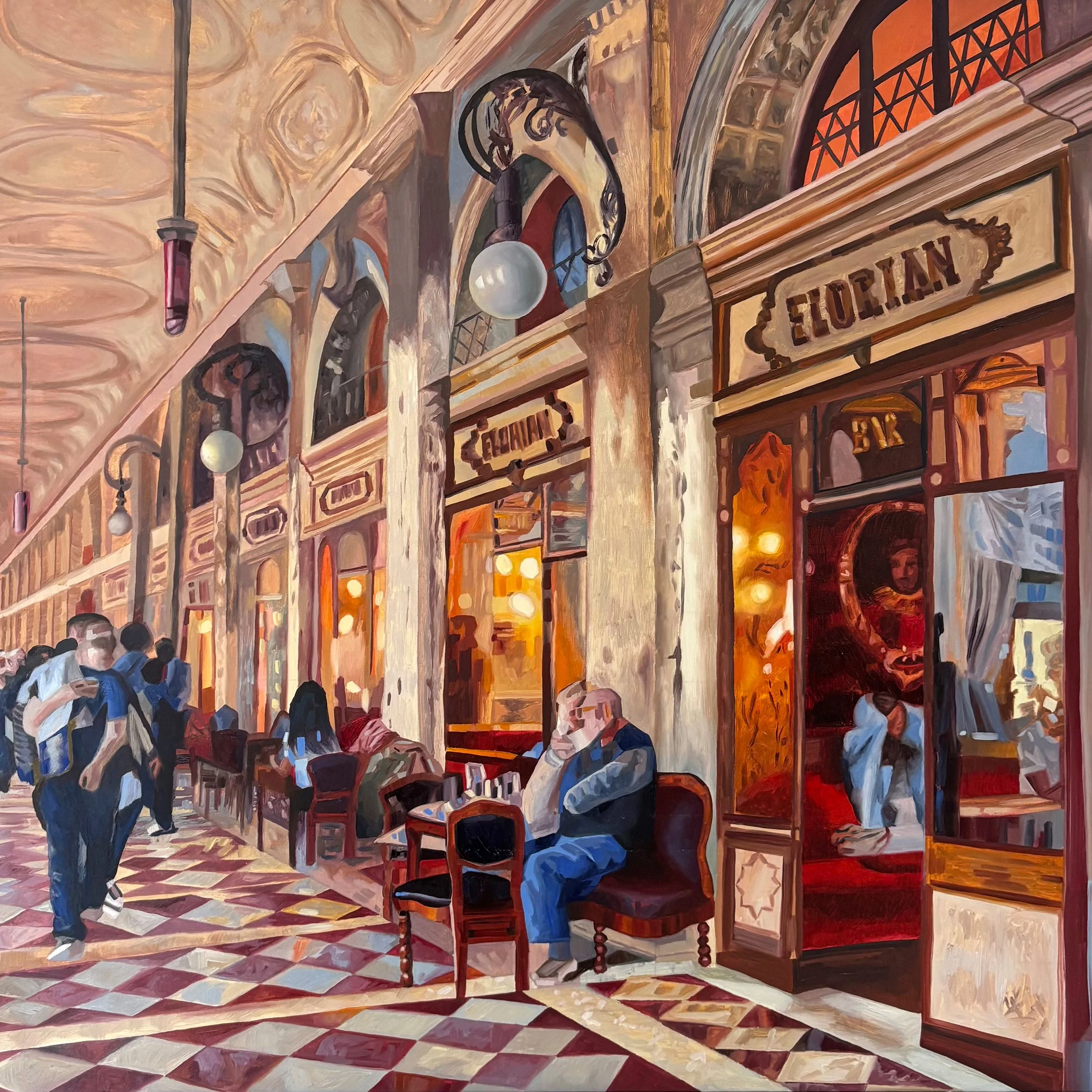 Painted on premium linen, the piece captures the glow, rhythm and atmosphere of the space while balancing bold architectural lines with intimate human moments.