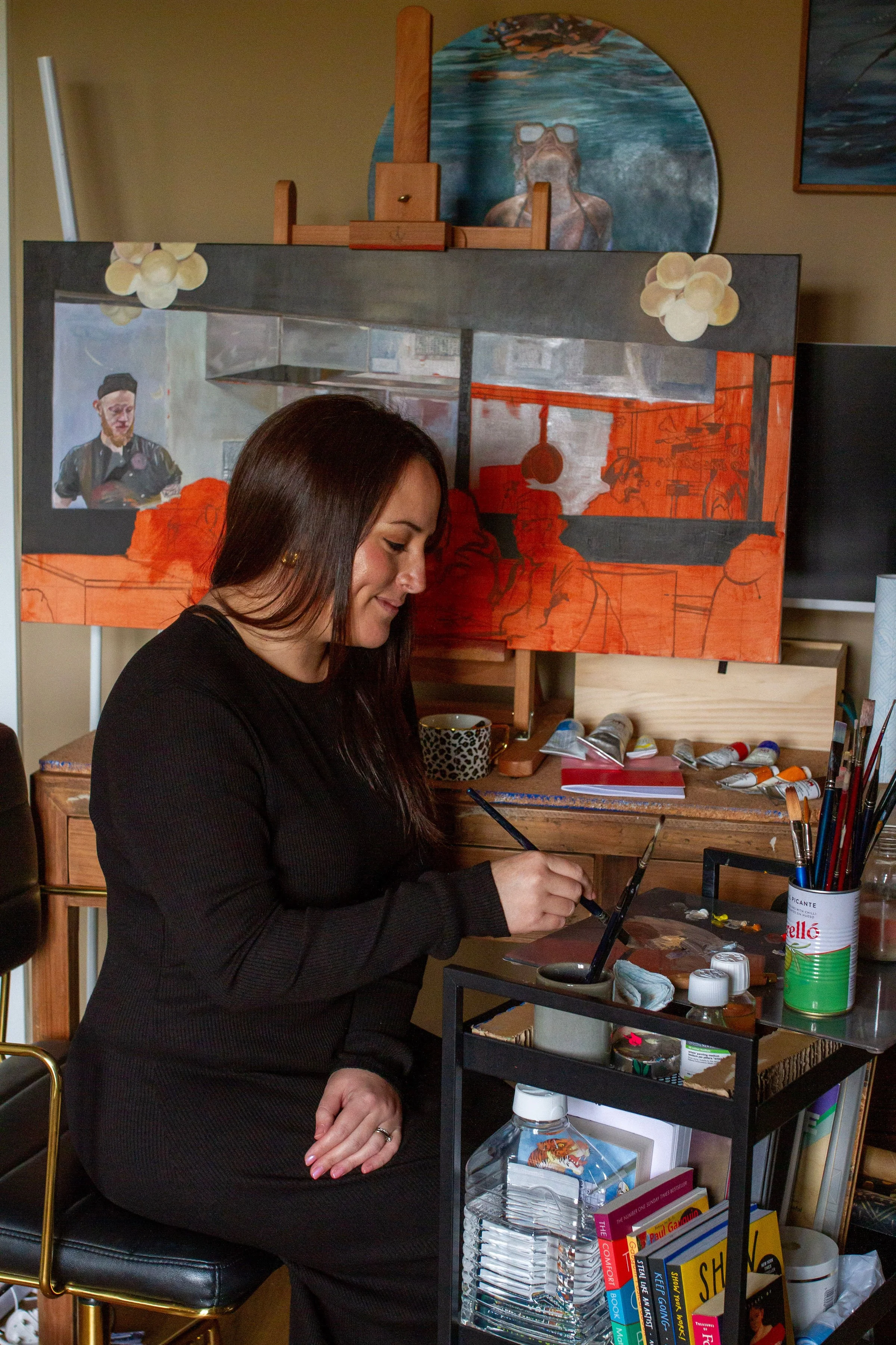 Influenced by Gustav Klimt, Peter Doig and Martine Johanna, her work blends elements of fashion, cinema and vintage Americana — moving between intimate portraits and moody urban scenes.