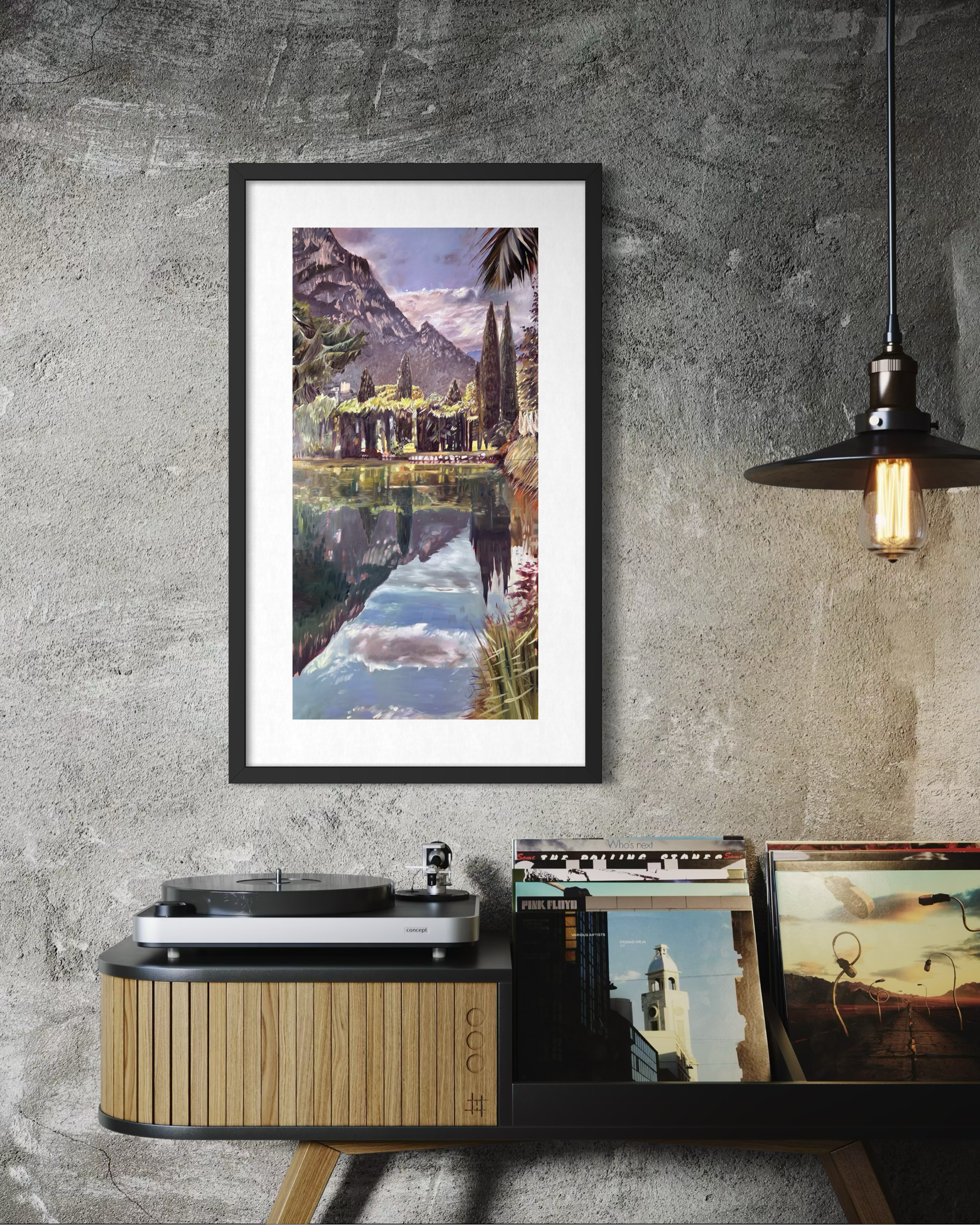 This piece was painted from a photo taken during a long weekend at Du Lac et Du Parc Hotel, Lake Garda — a quiet, memorable moment in the grounds of the resort. It marked a shift in my practice, being my first true landscape after years of painting figures and portraits. I wanted to capture the stillness, warmth, and reflection of that scene — using a tall, narrow crop to evoke scale, space, and the colours bring to the life the dreamy heat of the day.